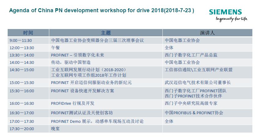 2018年7月23日~24日,中國電器工業協會變頻器分會三屆三次理事會暨西門子PROFINET技術開發傳動專題研討會在北京隆重舉行。武漢邁信電氣技術有限公司作為國內首家成功研發出PROFINET伺服并支持PROFIDrive行規的伺服廠商受邀參加。