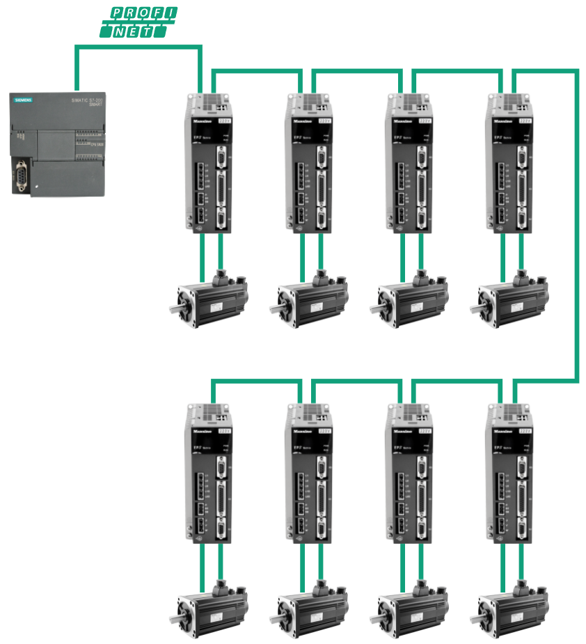 西門子S7-200 SMART PLC通過PROFINET接口與EP3E PROFINET伺服驅動器連接。