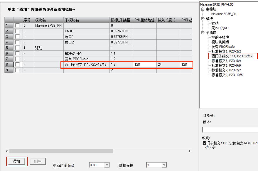 5. 添加111報文到模塊列表中,最小的更新時間為4ms,并記住此處分配的輸入輸出起始地址: