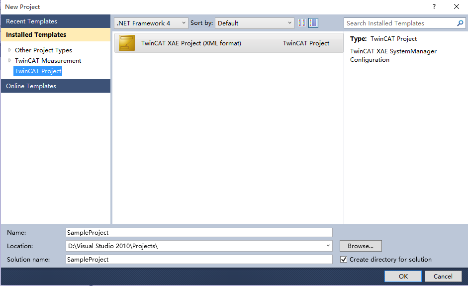 在建立工程界面中選擇TwinCAT Project,填入工程名稱,選擇工程保存地址,點擊OK。