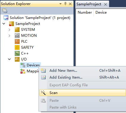 在配置模式下,點擊左側工程欄內IO,右鍵Devices,點擊Scan,