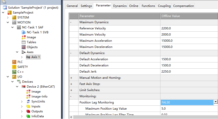 點擊左側工程欄中MOTION→Axes→Axis1,將Parameter窗口中的Monitoring下Position Lag Monitoring 改為false(關掉跟隨誤差監視);