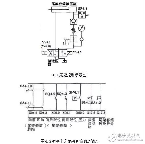 故障現象:該數控車床配備FANUC-OT系統,當腳踏尾座開關使套筒頂尖頂緊工件時,系統產生報警。尾架套筒的示意圖和PLC輸入開關分別如圖4.1和4.2所示。
