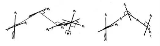 通常空間定位需要6個自由度,利用附加的關節可以幫助機構避開奇異位形。下圖為7自由度操作臂位形。