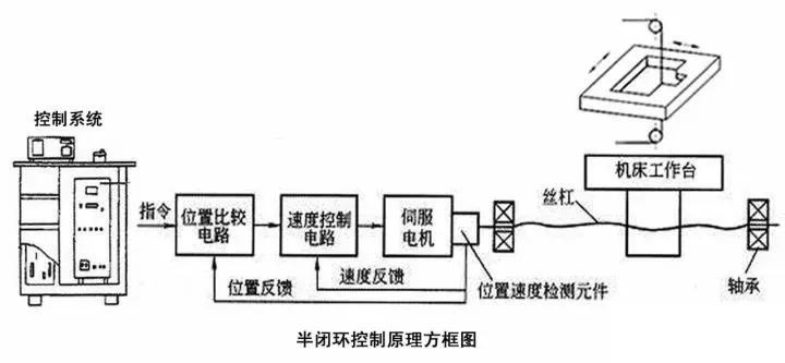 半閉環(huán)控制系統(tǒng)的工作原理和全閉環(huán)伺服系統(tǒng)相似,只是位置檢測(cè)器不是安裝在工作臺(tái)上,而是安裝在伺服電機(jī)的軸上的編碼器作反饋運(yùn)動(dòng)控制。