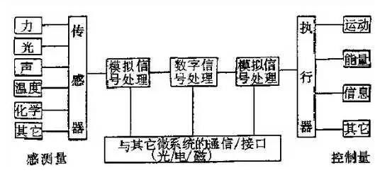 MEMS簡單來說就是將傳統(tǒng)傳感器的機(jī)械部件微型化后,和其他元件如微執(zhí)行器和微電子器件組成的集成體。雖說如此,MEMS并不像編碼器一樣必須要有電路板、碼盤等固定元件,其高集成度特點可以根據(jù)不同的工控場合進(jìn)行任意元件的組合,而典型的MEMS系統(tǒng)如下圖所示: