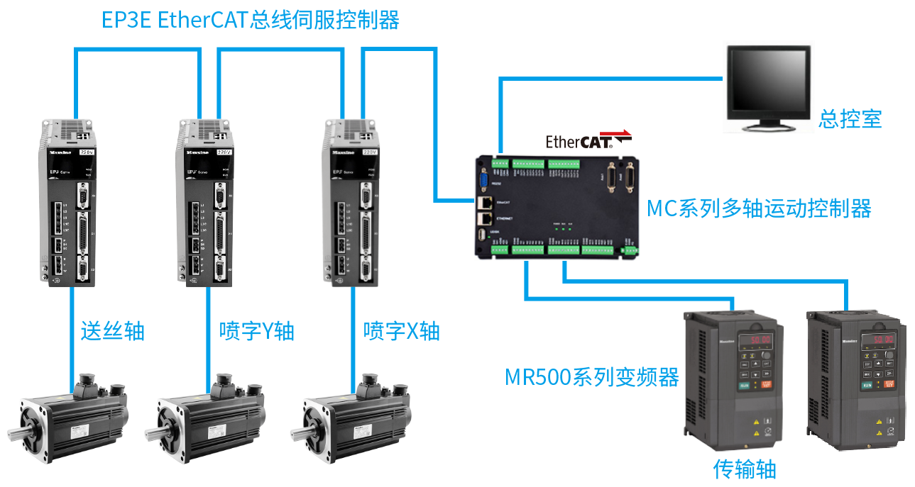 采用邁信電氣EP3E-EtherCAT總線伺服驅(qū)動器,MC系列總線多軸運動控制器,MR500系類變頻器,多圈絕對值伺服電機。系統(tǒng)能夠遠距離傳輸,抗干擾性能強,響應(yīng)速度快,參數(shù)讀取方便,特有的字體規(guī)劃軟件方便快速開發(fā)。