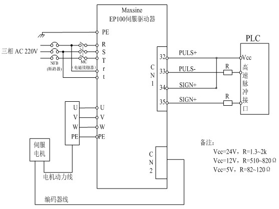 伺服驅動器工作在位置模式,通過接受PLC的脈沖信號工作,電機的運行方向、運行速度都可以通過PLC進行調節。